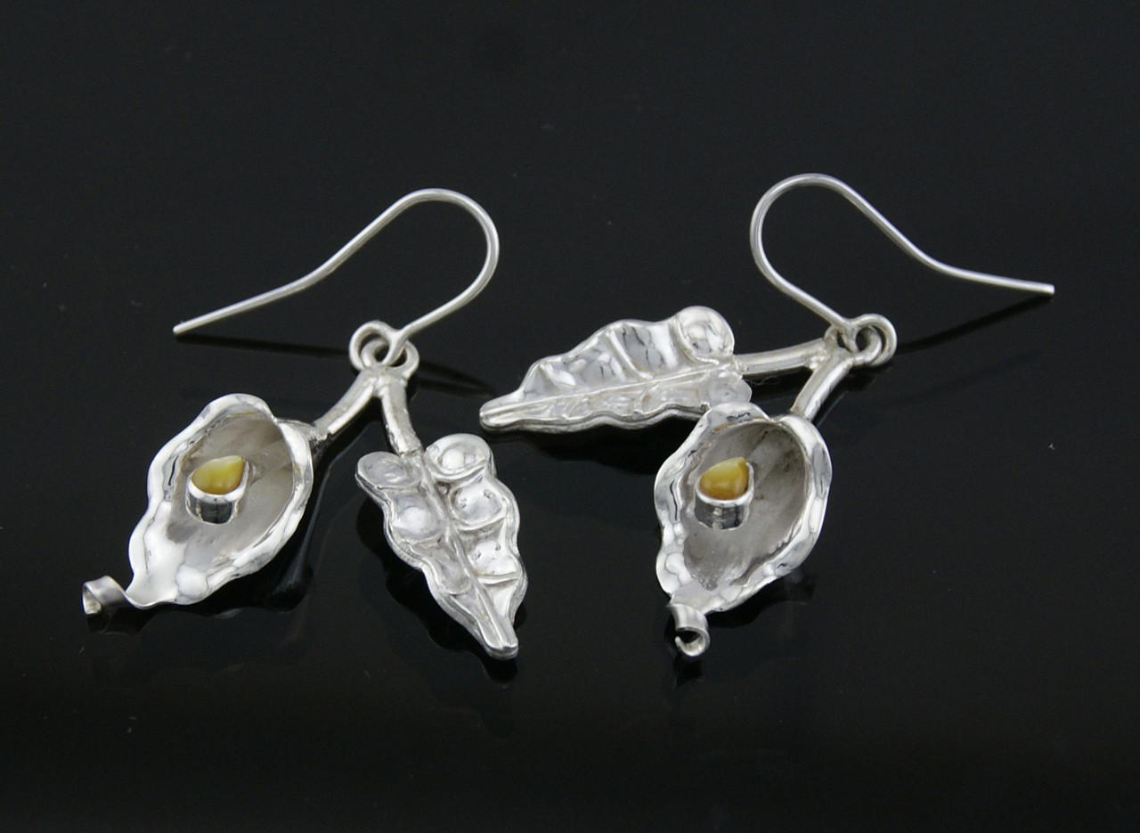 Beautiful Lily earrings handcrafted using 950 Silver, handcut and polished Nacre shell. Made in Cusco, Peru. Hallmarked by well known Artisan making this piece highly collectible.
